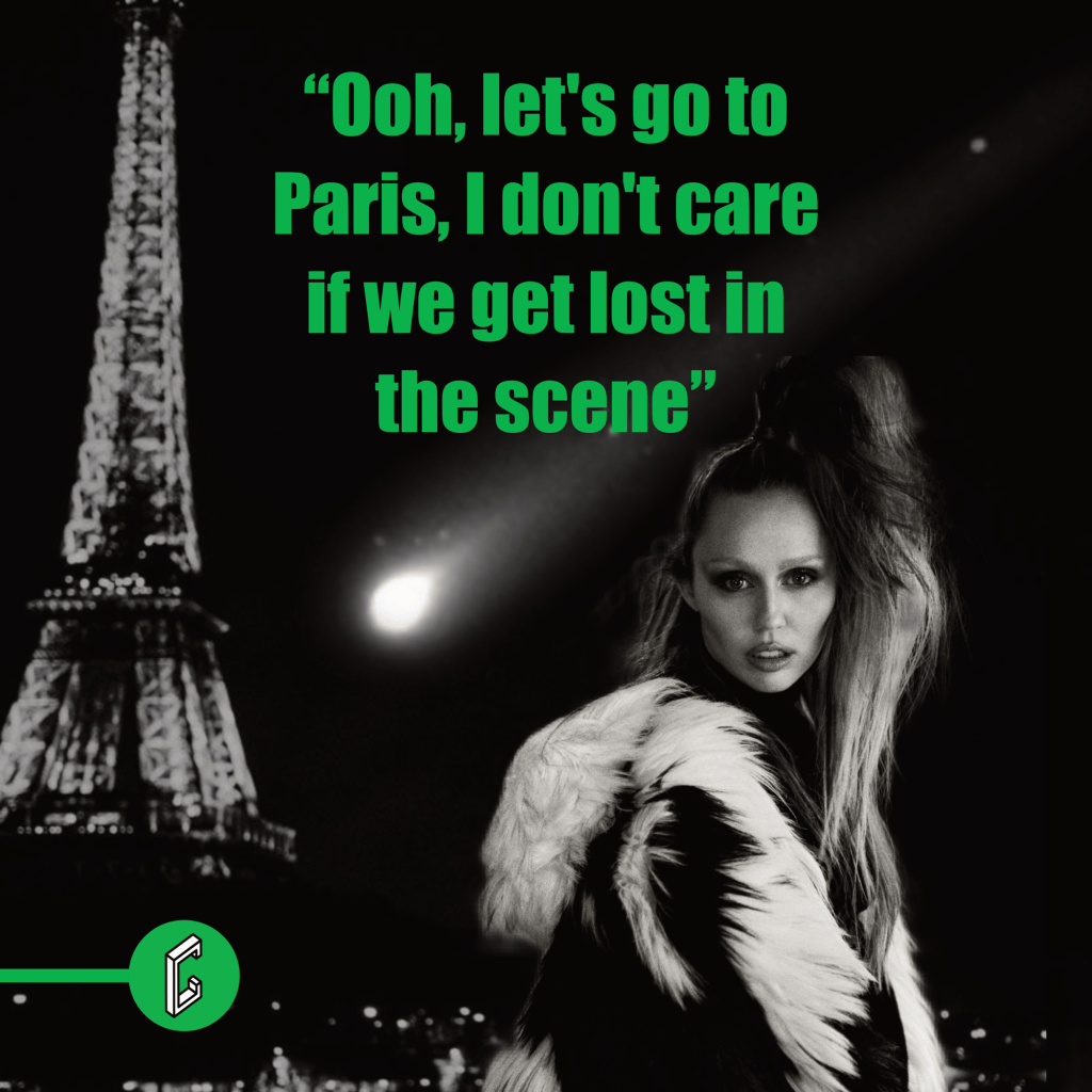 I love the simplicity of the music video, but given the song’s narrative, it’s hard not to imagine Miley releasing an alternative visual – a short film depicting this apocalyptic scenario. Picture Miley Cyrus as this California woman, in love with a handsome and strong partner, with scenes of them on the beach, under the covers, sharing intimate moments, alongside friends throwing a final party as the world literally ends around them. Imagine close-ups of Miley’s mesmerizing eyes reflecting the sky in flames. Then, cut to Miley in Paris, draped in a fur coat, sipping champagne, singing and dancing with the Eiffel Tower as a backdrop. I’d also include beautiful snippets of everyday people doing meaningful but simple (or very crazy) things… this song truly awakens my inner video producer-director-whatever-you-want-to-call-it!